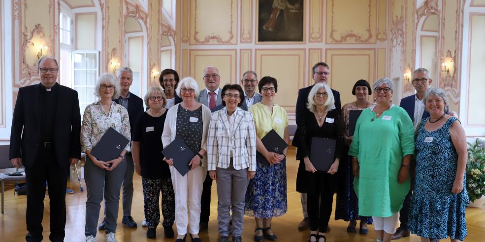 Die Absolvent*innen des Kurses 'Begräbnisse leiten' für ehrenamtlich Engagierte 2022 bei der Abschlussveranstaltung mit Bischof (links) und Kursleitung (rechts).