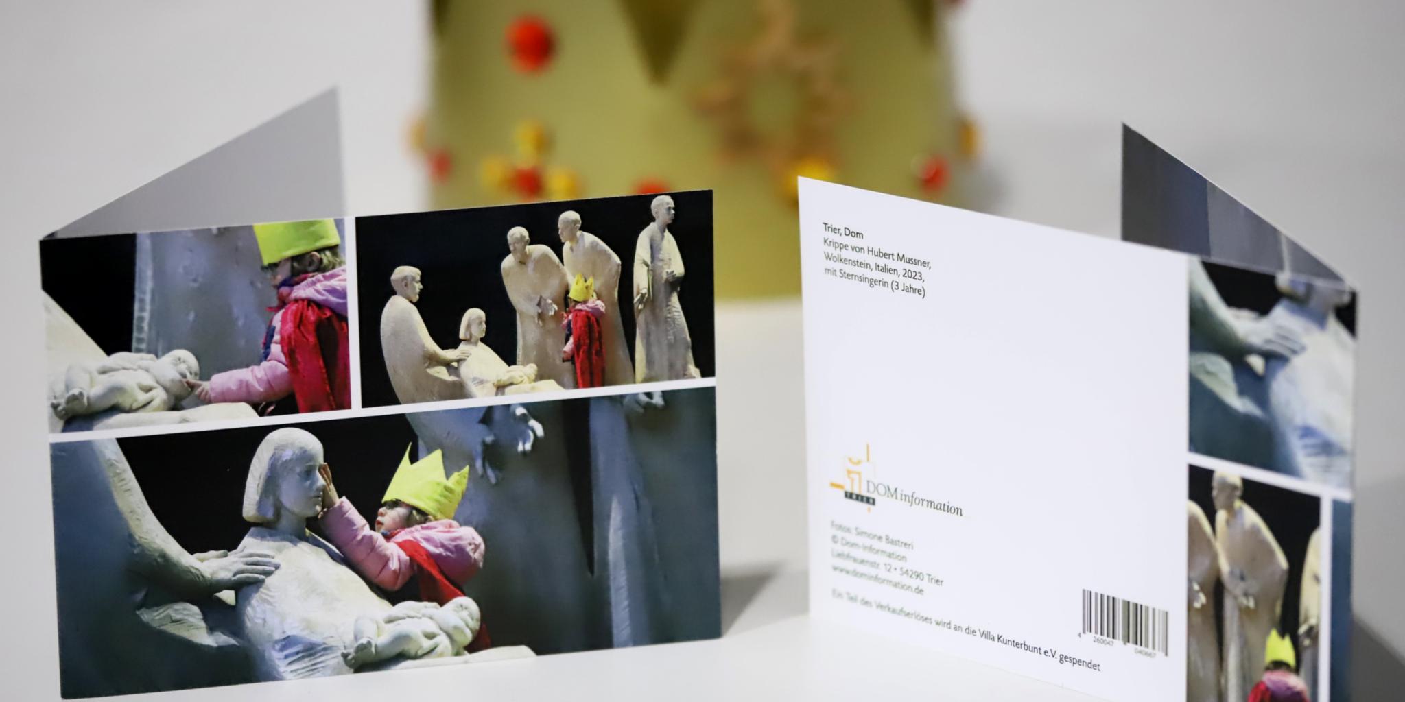 Trier – In der Dominformation und an der Verkaufsstelle der Domschatzkammer gibt es ab dem 1. Adventswochenende exklusiv eine neue Weihnachtskarte mit Motiven der Domkrippe, die 2023 in der Weihnachtszeit auf der Altarinsel aufgestellt wurde. Dabei zeigen die außen und innen aufgedruckten Fotomotive nicht nur die kunstvoll gearbeiteten Figuren des Künstlers Hubert Mussner aus dem Grödnertal. Vor ihnen steht eine junge Sternsingerin aus dem Bistum Trier, die staunend die Krippenfiguren berührt – eine spontane Momentaufnahme, die die Botschaft von Weihnachten mit Symbolkraft verdeutlicht: Sich von der Geburt Jesu und der Menschwerdung Gottes berühren zu lassen und seinen eigenen Platz in diesem Geschehen einzunehmen.