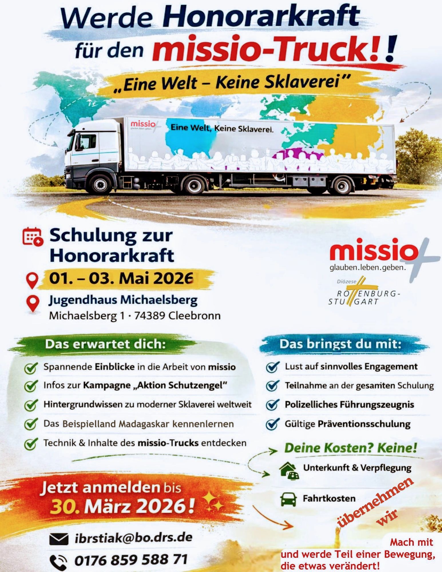 Werden Sie Honorarkraft für den missio-Truck. Die schulung findet im Jugendhaus Michaelsberg im Bistum Rottenburg-Stuttgart statt. Nach der erfolgreichen Schulung möglich sind Einsätze in deutschsprachigen Raum. missio-Truck ist eine digitale Ausstellung zum Thema "Eine Welt.Keine Sklaverei." und wird in Kooperation mit missio-Aachen auch nach Bistum Trier eingeladen.